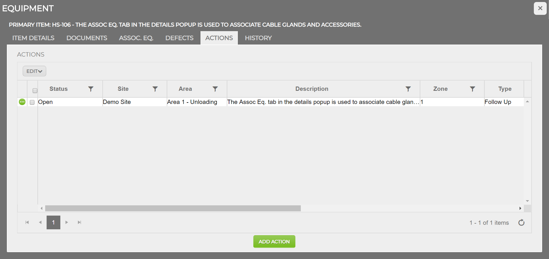NOTE: Some fields on this page cannot be edited directly by the user, marked by a grey textbox. The tag, site, area and description are all taken from the equipment details in the tag browser. The Type is the type of action selected by the user when creating the action on Ex-Online, or will be ‘Follow Up’ when the action is generated from an Inspection Check Sheet (ICS). Action Details are populated from comments on the ICS or from the description entered on Ex-Online, once entered these details cannot be edited. Open date is the date and time in Coordinated Universal Time (UTC) when the action was created through either manual entry or import of an ICS.