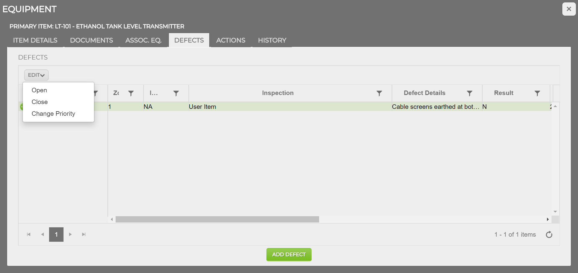 NOTE: Some fields on this page cannot be edited directly by the user, marked by a grey textbox. The tag, site, area and description are all taken from the equipment details in the tag browser. The item number is an internal number correlating to questions on the inspection check sheets (ICS), Inspection will show the question from the ICS; however if entered in the additional defects field or on Ex-Online it will show up as User Item. Defect Details are populated from comments on the ICS or from the description entered on Ex-Online, once entered these details cannot be edited. The Result shows the inspection result of the relevant question from the ICS, this field will be either N or NC depending on the result and whether the ‘Ignore NC inspection results (do not create defects)’ setting is enabled.